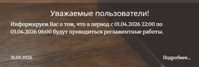 Информируем Вас о том, что в период с 22:00 01.04.2026 по 06:00 03.04.2026 будут проводиться регламентные работы.