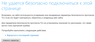 Не удается безопасно подключиться к этой страницеВозможно, на сайте используются устаревшие или ненадежные параметры безопасности протокола TLS. Если это будет повторяться, обратитесь к владельцу веб-сайта.